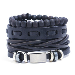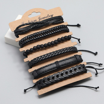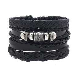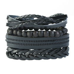 Conjunto de pulseras de cuero negro para hombre y mujer, cuentas de aleación trenzadas, brazalete, cordón, pulsera ajustable, conjunto de pulseras de cuero, color negro