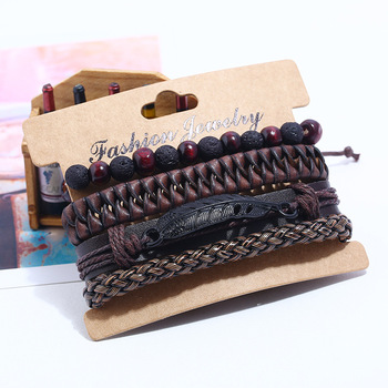 TZ153 Hombres Punk 4 piezas Conjunto de pulsera Cuentas de lava Plumas negras Cuero trenzado multicapa Cuerda trenzada Pulsera ajustable Regalo